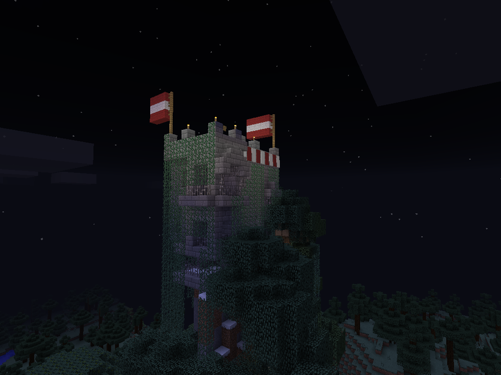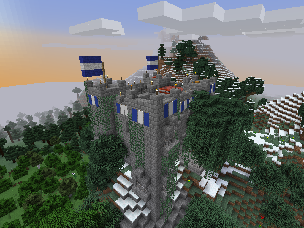 Both the Red Castle and the Blue Castle have TNT on the roof and a button to detonate them, the spawn point is half way between the castles. Both castles have armories stocked with team armor, bows, axes and swords. There is a secret passageway up to both castles. Set the game mode to adventure, set each teams spawn points on the castles roofs by sleeping the first night there and then let the battle commence, the first team to blow up the other teams castle wins!